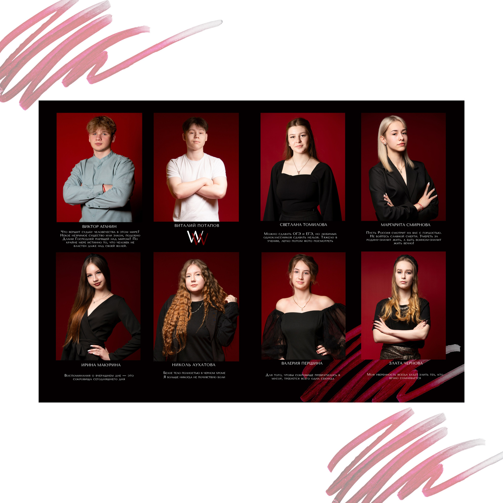 - Обложка с портретом 1 разворот виньетка с цитатами (8 человек)